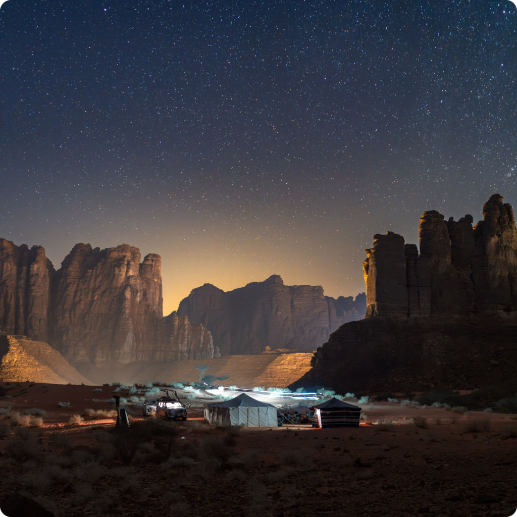 Luxury Adventure with Glamping : The magic of the Kingdom’s cultural, historical and natural wonders are revealed on this eleven-day journey. Among the many highlights is a night spent at EXO’s private desert camp in Wadi Disah. Set among tall rock columns and lush vegetation, mobile tents offer comfort with proper beds and shared facilities.