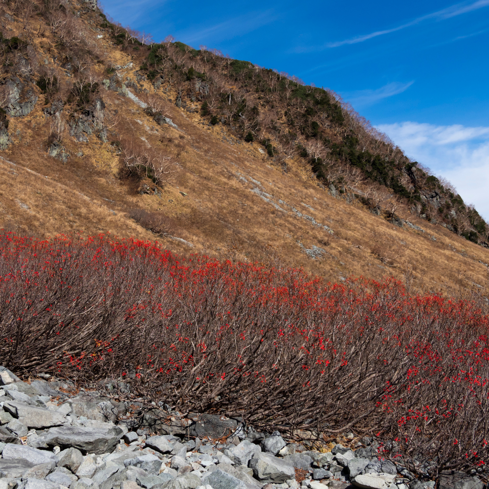 The name ‘nanakamdo’ covers a variety of trees and shrubs found in the mountains, typically in areas of higher elevation. They dominant areas where large trees are sparse and turn an array of colours, creating a beautiful mosaic of red, yellow and orange.