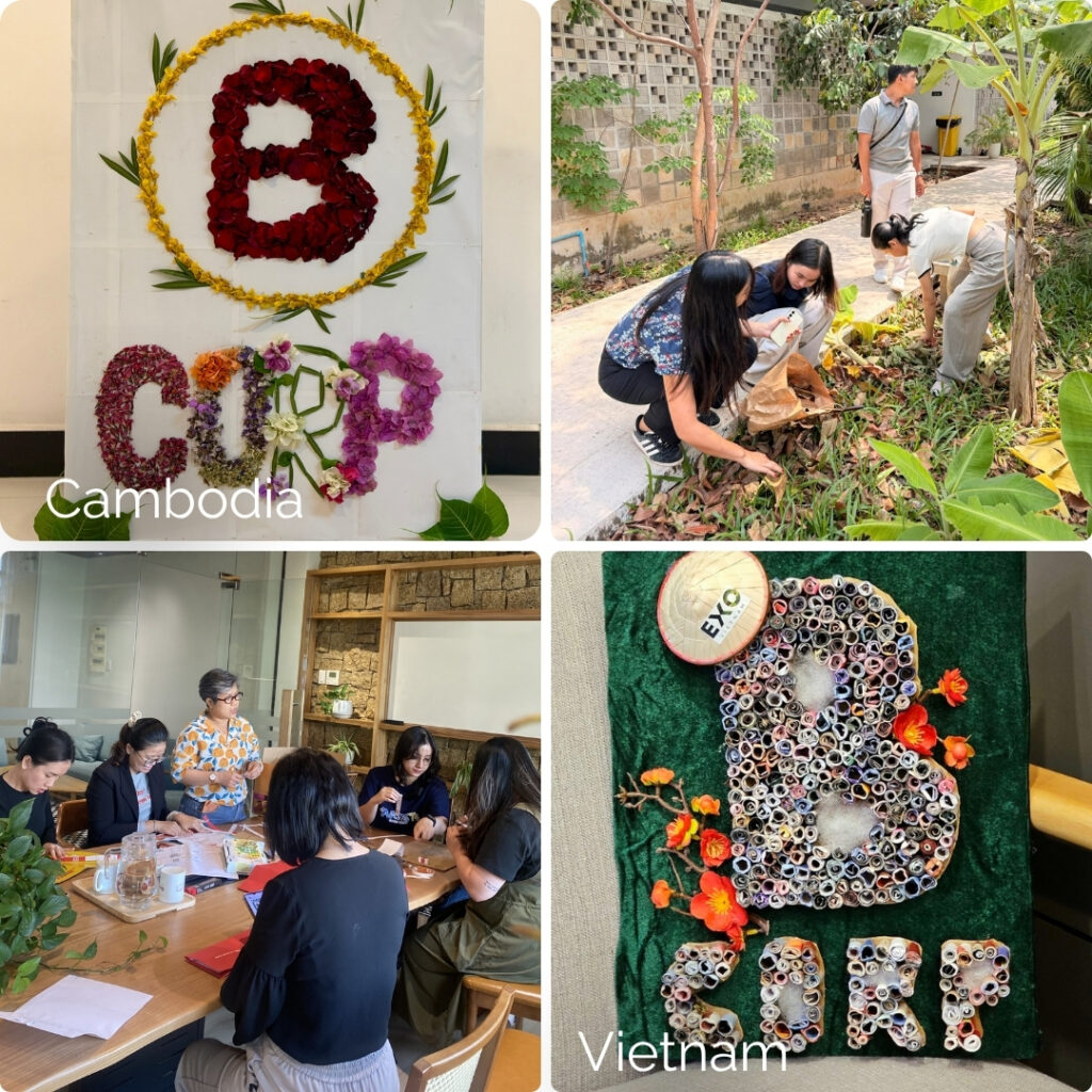 Vietnam created the B Corp logo using 100% recycled materials, from repurposed cardboard and scrap paper to decorative elements reused from Tet. Cambodia took a similarly thoughtful approach, collecting fallen flowers and leaves and arranging them into the logo within a recycled frame.