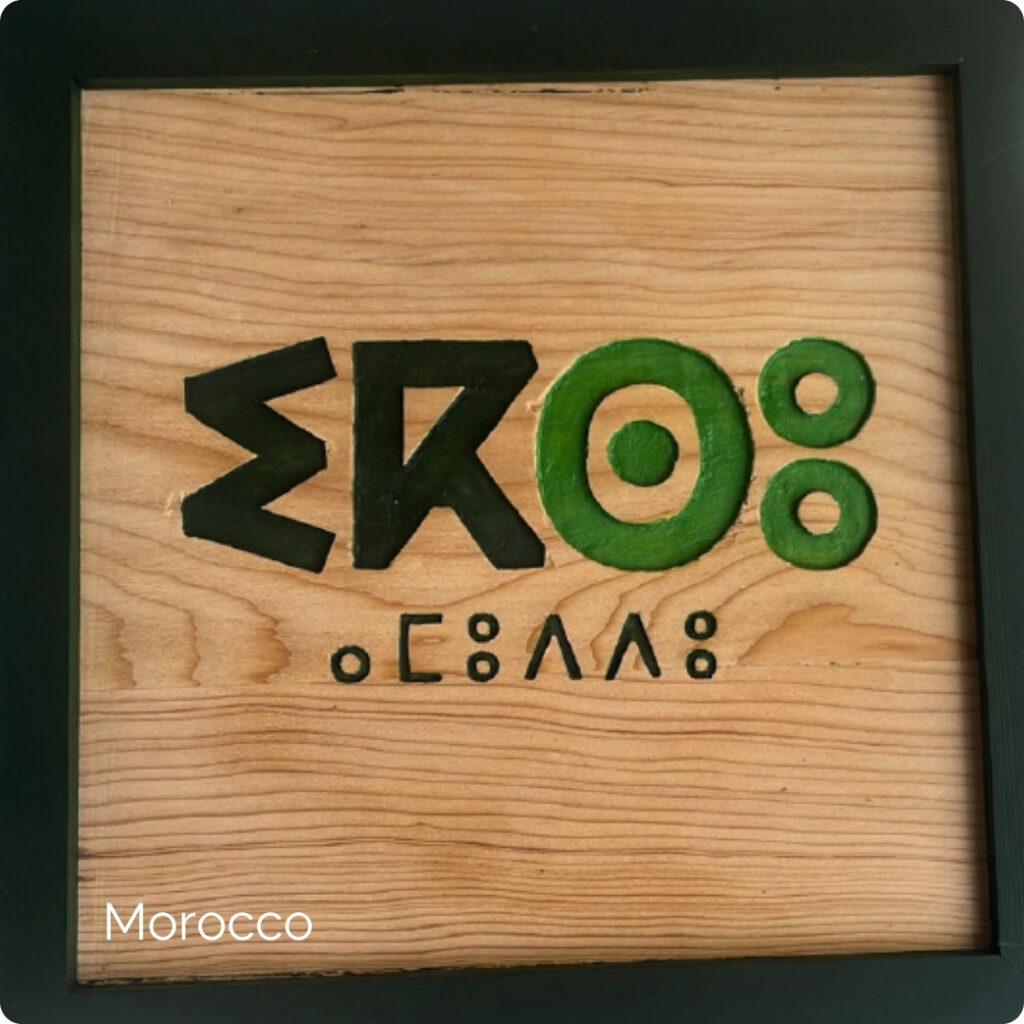 A handcrafted wooden piece created in Essaouira represents EXO Travel in Amazigh script, using natural materials and local artistry to express values of cultural preservation, community support and responsible travel.