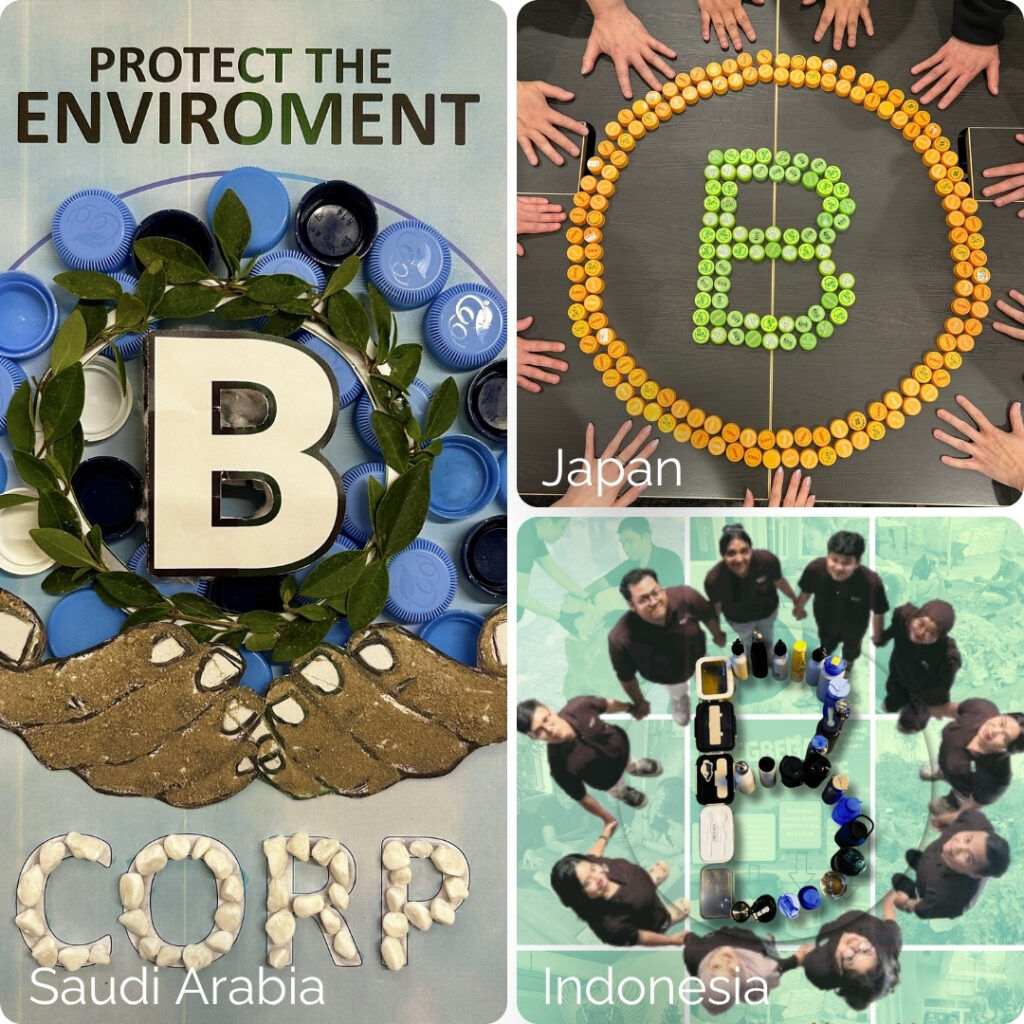 In Indonesia, the Sustainability Team formed the B Corp logo using reusable tumblers and lunch boxes belonging to team members, highlighting how simple daily habits can reflect a wider commitment to reducing waste. In Japan, the team used recycled bottle caps to form the ‘B’, a reflection of their daily commitment to recycling in the office. Saudi Arabia also drew on reused and natural elements, including sand, leaves, stones and repurposed materials, to create a design rooted in environmental awareness.