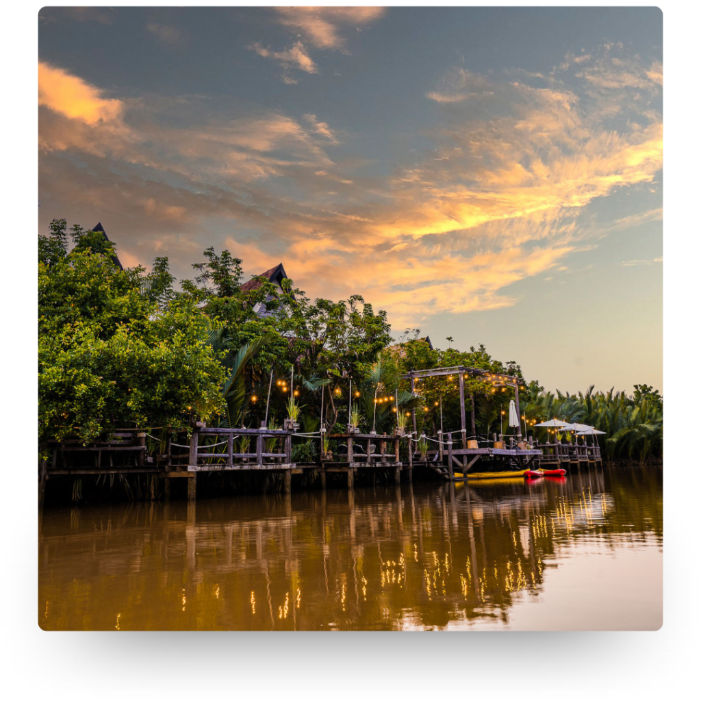 In the heart of Green Cathedral, away from the hustle and bustle of Kampot town. The brand new River Tree Villa hotel is the perfect choice for those looking for an establishment in the heart of nature and the Cambodian jungle. Its 19 rooms offer an intimate and peaceful setting. We recommend the succulent seafood barbecue. The hotel also offers a boat trip on the canal, an experience not to be missed!