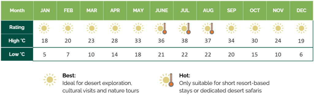 The Western Desert is at its best in the cooler months from October to April, with mild days and chilly nights. Summers can be extremely hot, making travel uncomfortable except for short resort stays near water.
