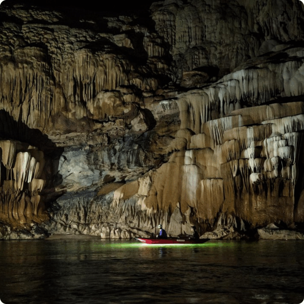 The park’s most iconic feature is Tham Khoun Xe, a colossal river cave carved by the Xe Bang Fai River. Stretching over 7 kilometres, the cave’s main passage is wide enough to house a cathedral and tall enough to swallow a ten-storey building. Travellers can enter by boat, floating through cavernous chambers lit by shafts of sunlight and bioluminescent minerals. Inside, there are vast stalactites and stalagmites, limestone curtains, cave pearls and pristine pools of emerald water.