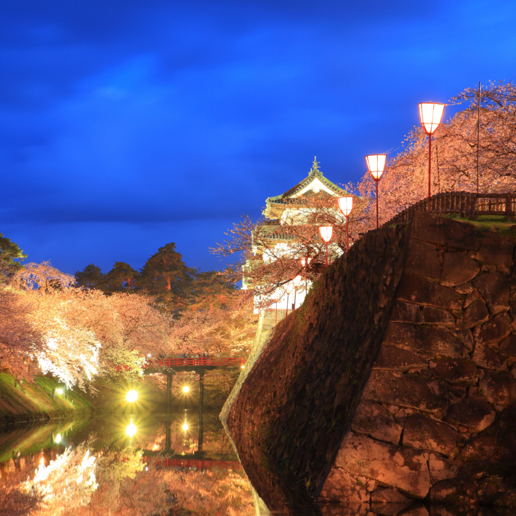 Hirosaki: Hirosaki, just thirty minutes by train from Aomori, is home to one of Japan’s most famous cherry blossom spots, Hirosaki Castle Park. With more than 2,500 trees and the backdrop of a traditional castle, the picturesque setting rivals any scene along the Golden Route. The sakura season in Hirosaki also includes magical nighttime illuminations.