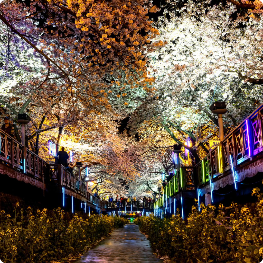 - Yeouido Spring Flower Festival (Seoul): Set against the backdrop of the Han River, this festival offers stunning views of cherry blossoms along the riverbanks, complemented by street performances, food stalls, and an impressive night-time display of illuminated trees.
