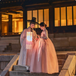Experience a magical evening in Seoul with a night hanbok photoshoot at Deoksugung Palace.