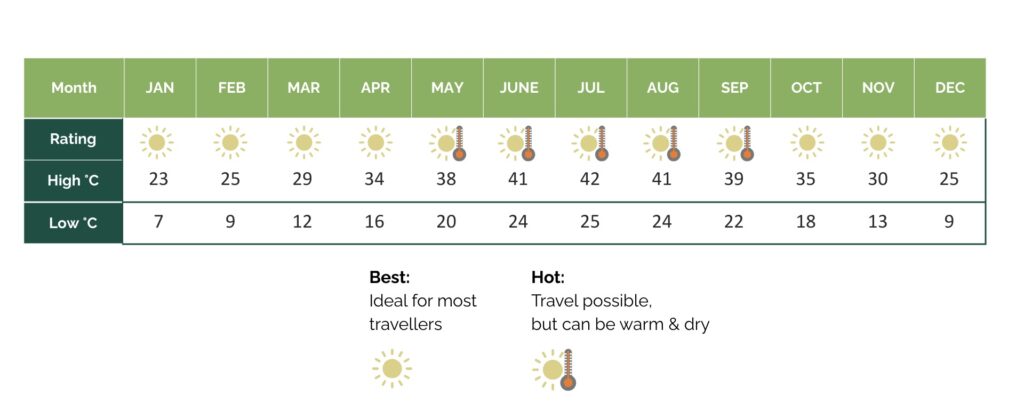 Luxor is best experienced in the cooler months from October to April, when daytime temperatures are pleasant for exploring temples, tombs and the open desert landscapes. Summers (May to September) are extremely hot, often exceeding 40°C, which can be challenging for some travellers. For those who can handle the heat, summer offers quieter sites and fewer crowds. Rain is almost non-existent year-round, making conditions very dry.