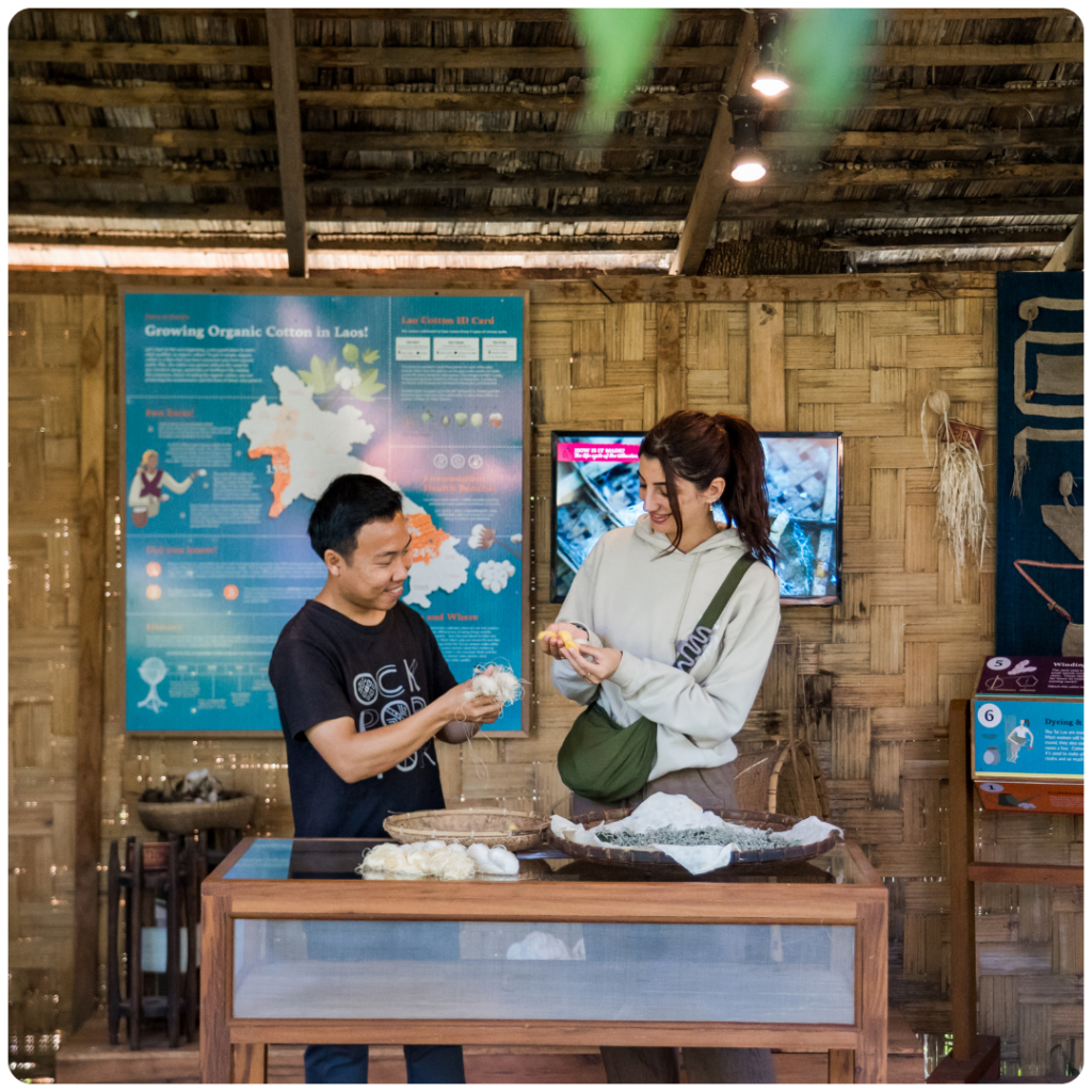 Valerie explains other options for travellers, ‘Through the free tours we offer of our Living Crafts Centre as well as free demonstrations by artisans on silk and cotton reeling, guests can learn more about Laos through textiles. Tourists can also learn traditional crafts (weaving, hmong batik, bamboo weaving, natural dyeing, and more) from local artisans in one of our many classes and workshops. All of which creates a better understanding of Lao textiles and the craftsmanship involved which then converts into sales’