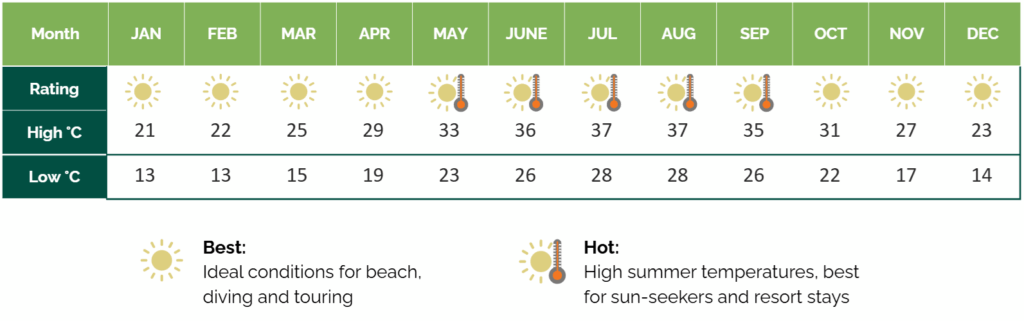 Sharm El Sheikh enjoys year-round sunshine, making it a reliable winter-sun escape for European travellers. Summers are hot but moderated by sea breezes, while spring and autumn are the most comfortable seasons for outdoor activities and diving.