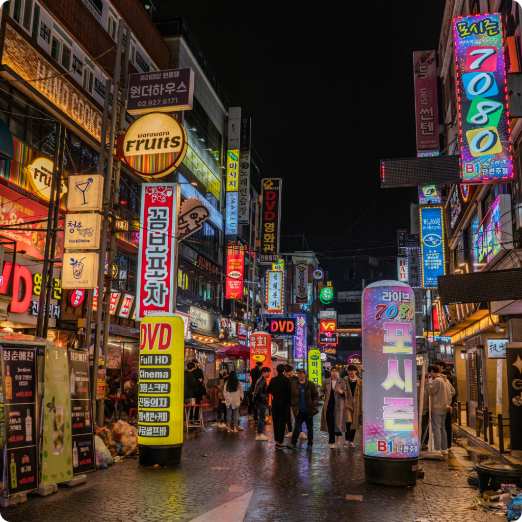 Seoul’s Hongdae district offers a nightlife experience that is quintessentially Korean. The area buzzes with energy, featuring lively bars, quirky cafes and vibrant streets.