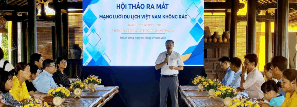 On 9 July, 2025, Trang Dao – Sustainability Coordinator at EXO Vietnam, attended the launch of the Vietnam Zero Waste Tourism Network at The Field Restaurant in Hoi An. Organised by the Da Nang City Provisional Tourism Association and the Pacific Environment Organisation Vietnam, the event brought together over 50 businesses, including several of our suppliers.