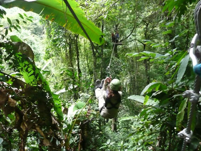 During the next 30-60 minutes, you’ll be swinging between a series of 20 platforms high up in the tropical jungle trees. And the view is awesome from up here! Check out the surrounding area’s flora and fauna from a bird’s-eye/monkey’s-eye view. And speaking of our feathered and ape friends, watch out for them hiding about in the trees.